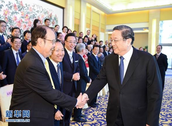 4月8日,中共中央政治局常委、全国政协主席俞正声在北京钓鱼台国宾馆会见“感恩侨爱——四川雅安芦山地震灾后重建巡礼”活动的全体代表。新华社记者谢环驰摄